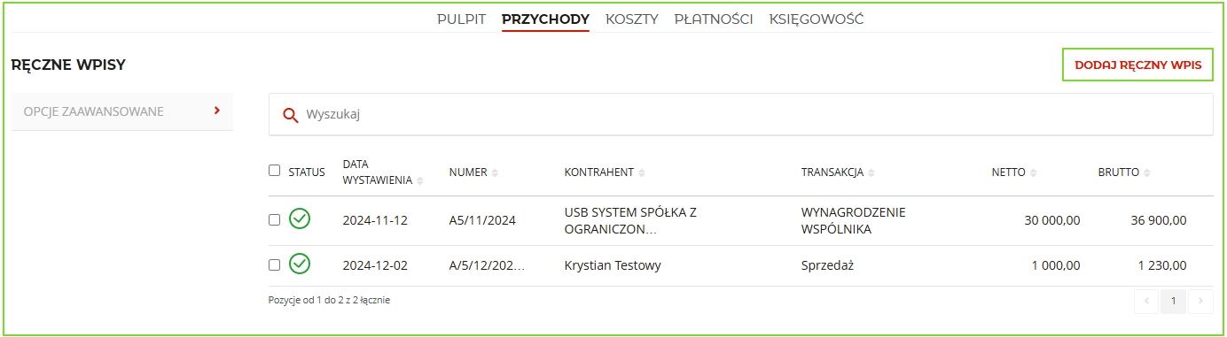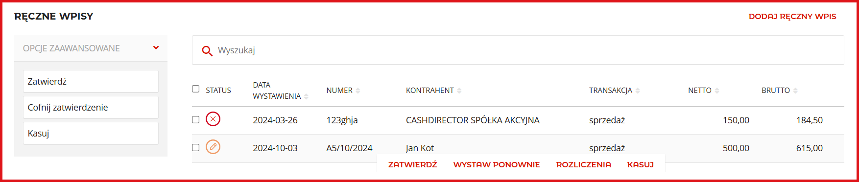 1. Kliknięcie w przycisk Opcje zaawansowane spowoduje rozwinięcie listy akcji wśród których znajduje się funkcjonalność Ręczne wpisy.
