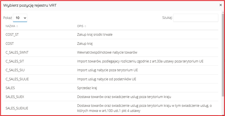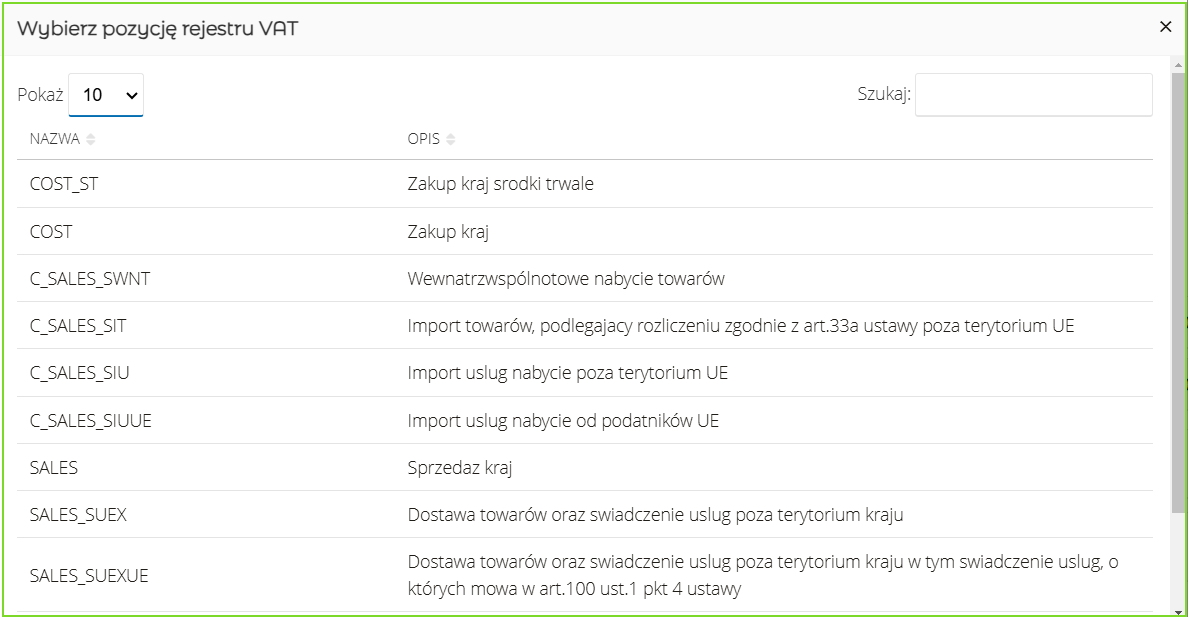 6. Po kliknięciu w Słownik, zostanie wyświetlone okno Wybierz pozycje rejestru VAT, które pozwoli na wybranie pozycji odpowiadającej właściwym polom rejestru/deklaracji VAT.