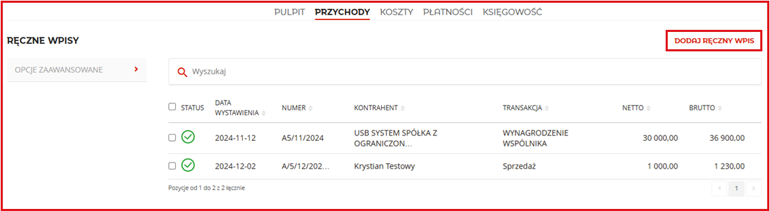 2.Wybór tego przycisku umożliwi dodanie nowej pozycji po kliknięciu w Dodaj ręczny wpis oraz wgląd do istniejącej listy wpisów i dokonania zmian.