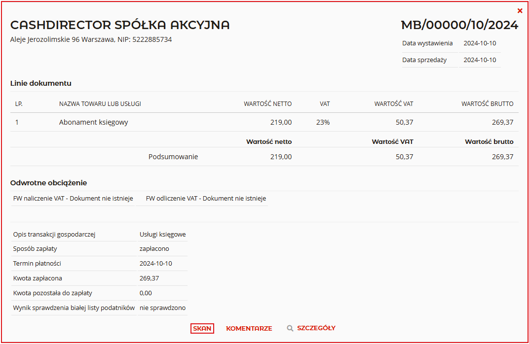 System mOrganizer Finansów umożliwia dodanie skanu do faktur, które zostały zaksięgowane ręcznie, zarówno w zakładce Przychody, jak i w Koszty. W tym celu należy kliknąć na dodaną fakturę i wybrać przycisk Skan: