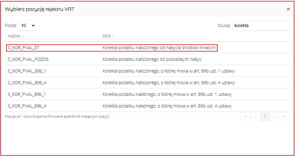 6. Kliknąć w polu Słownik i wybrać parametr Korekta podatku naliczonego od nabycia ST (poz. 44 JPK);