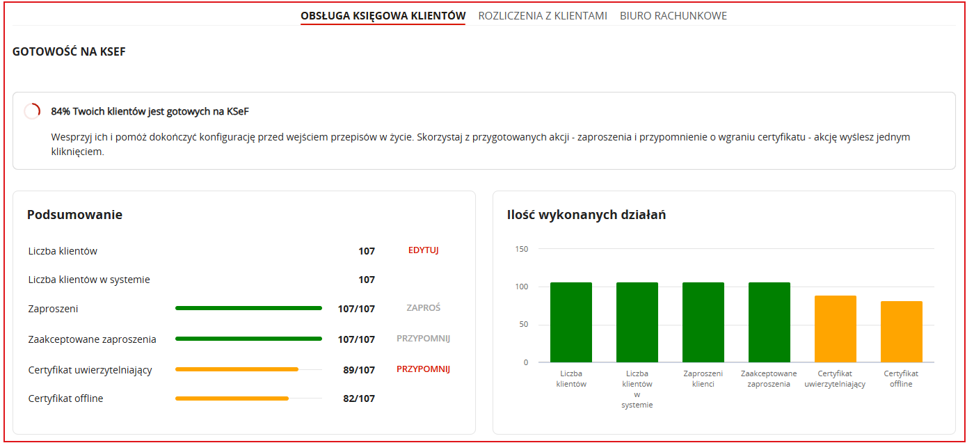 W zakładce Obsługa księgowa klientów/Gotowość na KSeF będą widoczne informacje w formie wykresów oraz podsumowania informujące o stanie rzeczywistym firm: