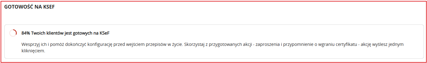 Poziom ilości firm wyświetlany jest jako procentowa informacja o gotowości klientów na KSeF. Obliczane jest to na podstawie liczby kont na module biura rachunkowego, które posiadają wgrane certyfikaty uwierzytelniające: