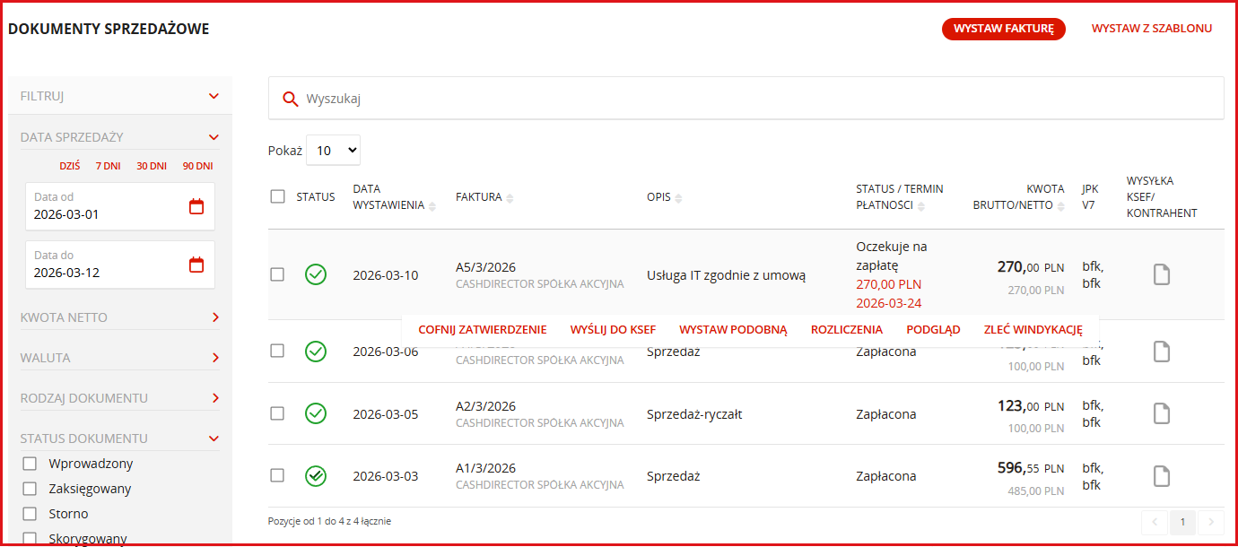 - na liście faktur, gdzie znajduje się wystawiony dokument sprzedaży,
