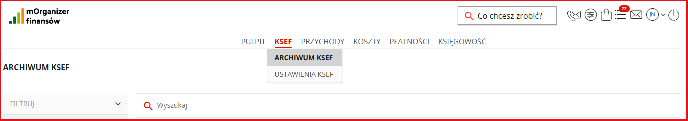 Zakładka dostępna jest jako podzakładka: KSeF/Archiwum KSeF. Zakładka dostępna jest dla wszystkich użytkowników systemu, niezależnie od posiadanego pakietu: