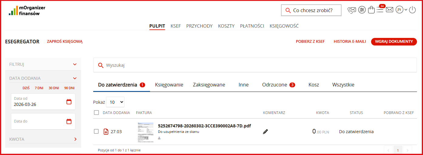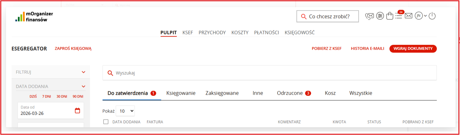 Dokumenty kosztowe, które zostały wystawione dla klienta i przesłane do KSeF, będą pobierane bezpośrednio z KSeF automatycznie do mOrganizera finansów zawsze w godzinach nocnych. Pobieranie dokumentów obejmuje zarówno faktury kosztowe, jak i przychodowe z zakresu dwóch dni wstecz.
